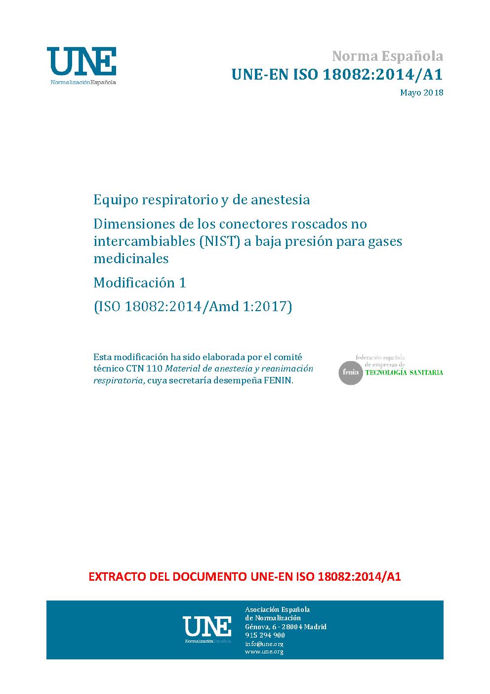 Anaesthetic and respiratory equipment - Dimensions of non-interchangeable screw-threaded (NIST) low-pressure connectors for medical gases - Amendment 1 (ISO 18082:2014/Amd 1:2017)