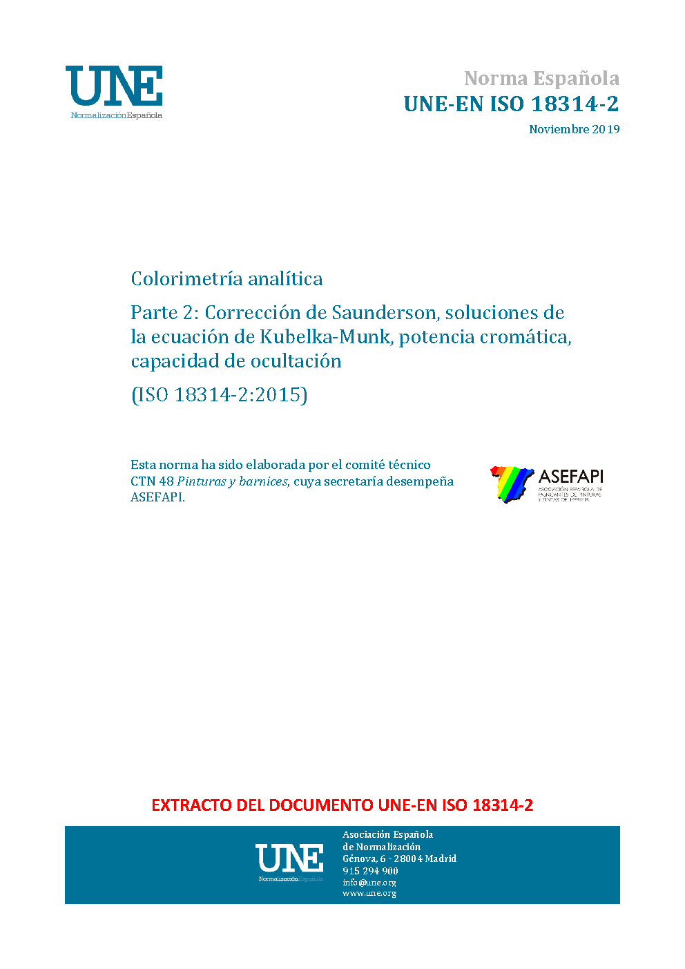 Analytical colorimetry - Part 2: Saunderson correction, solutions of the Kubelka-Munk equation, tinting strength, hiding power (ISO 18314-2:2015)