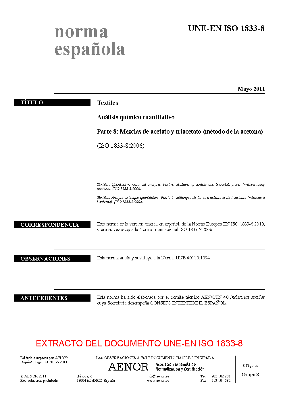 Textiles - Quantitative chemical analysis - Part 8: Mixtures of acetate and triacetate fibres (method using acetone) (ISO 1833-8:2006)