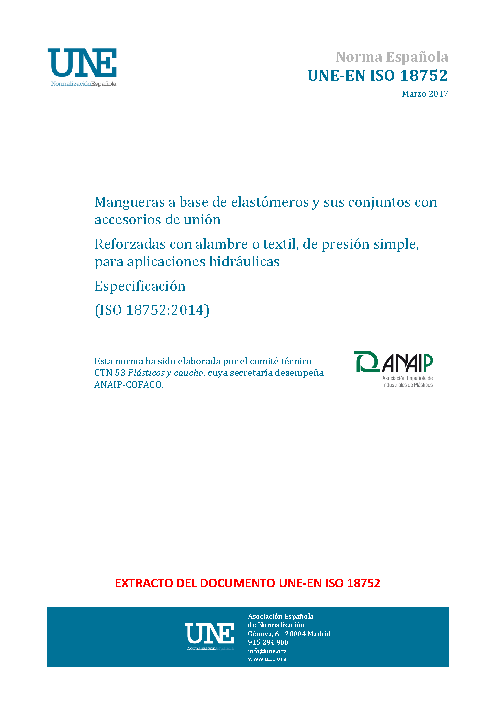 Rubber hoses and hose assemblies - Wire- or textile-reinforced single-pressure types for hydraulic applications - Specification (ISO 18752:2014)