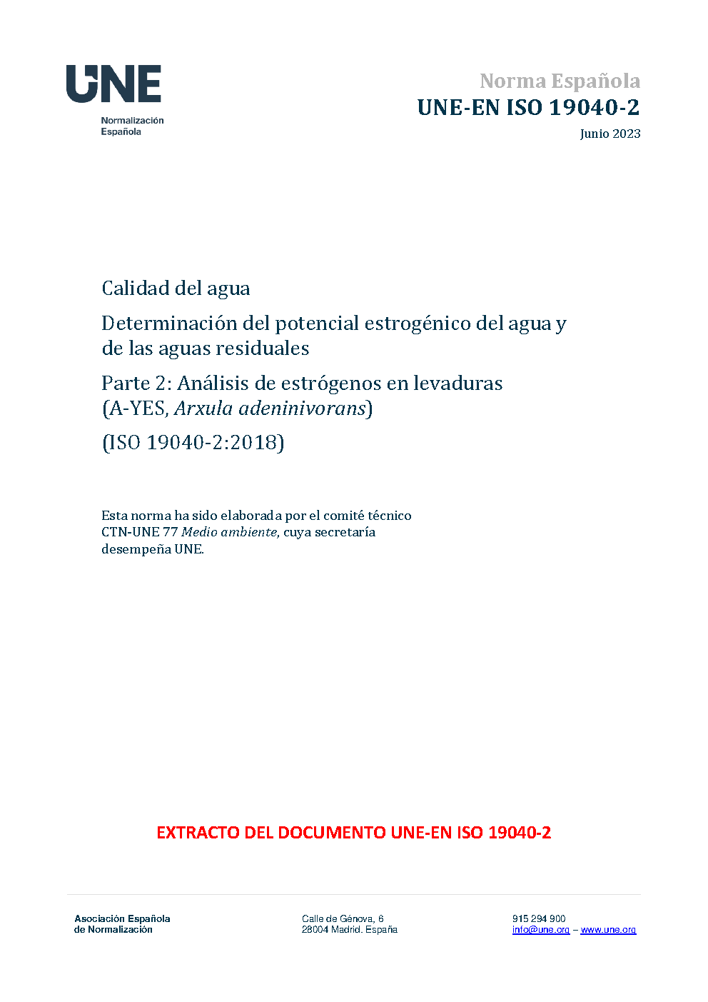 Water quality - Determination of the estrogenic potential of water and waste water - Part 2: Yeast estrogen screen (A-YES, Arxula adeninivorans) (ISO 19040-2:2018)