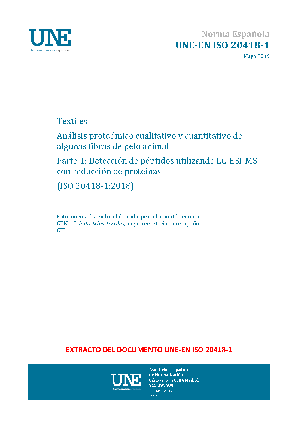 Textiles - Qualitative and quantitative proteomic analysis of some animal hair fibres - Part 1: Peptide detection using LC-ESI-MS with protein reduction (ISO 20418-1:2018)
