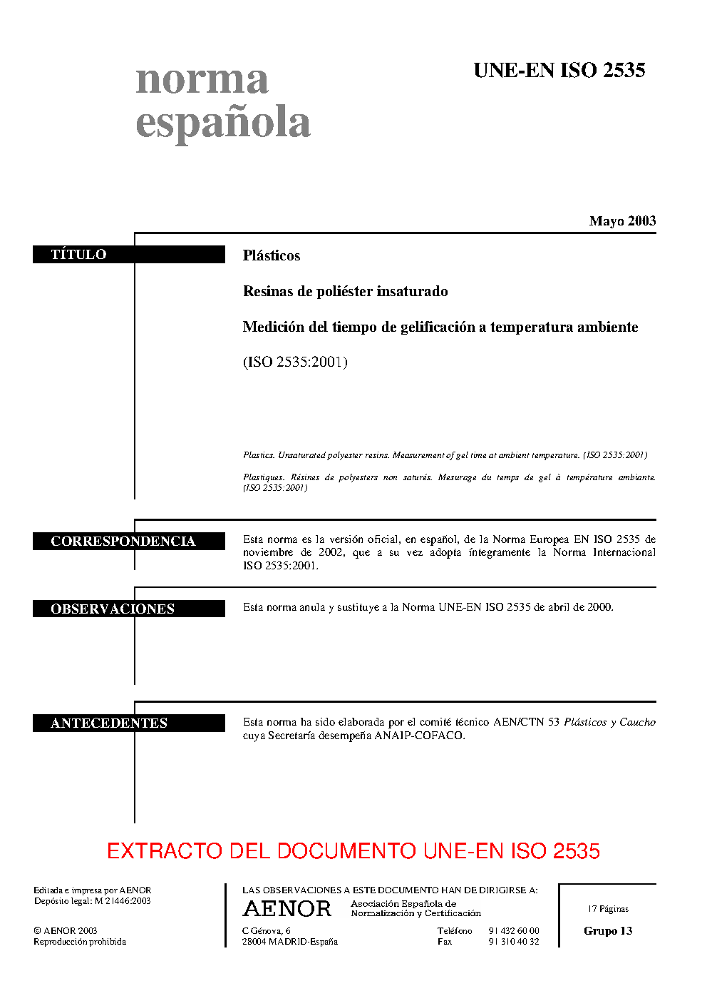 PLASTICS - UNSATURATED POLYESTER RESINS - MEASUREMENT OF GEL TIME AT 25 ºC (ISO 2535:1997)
