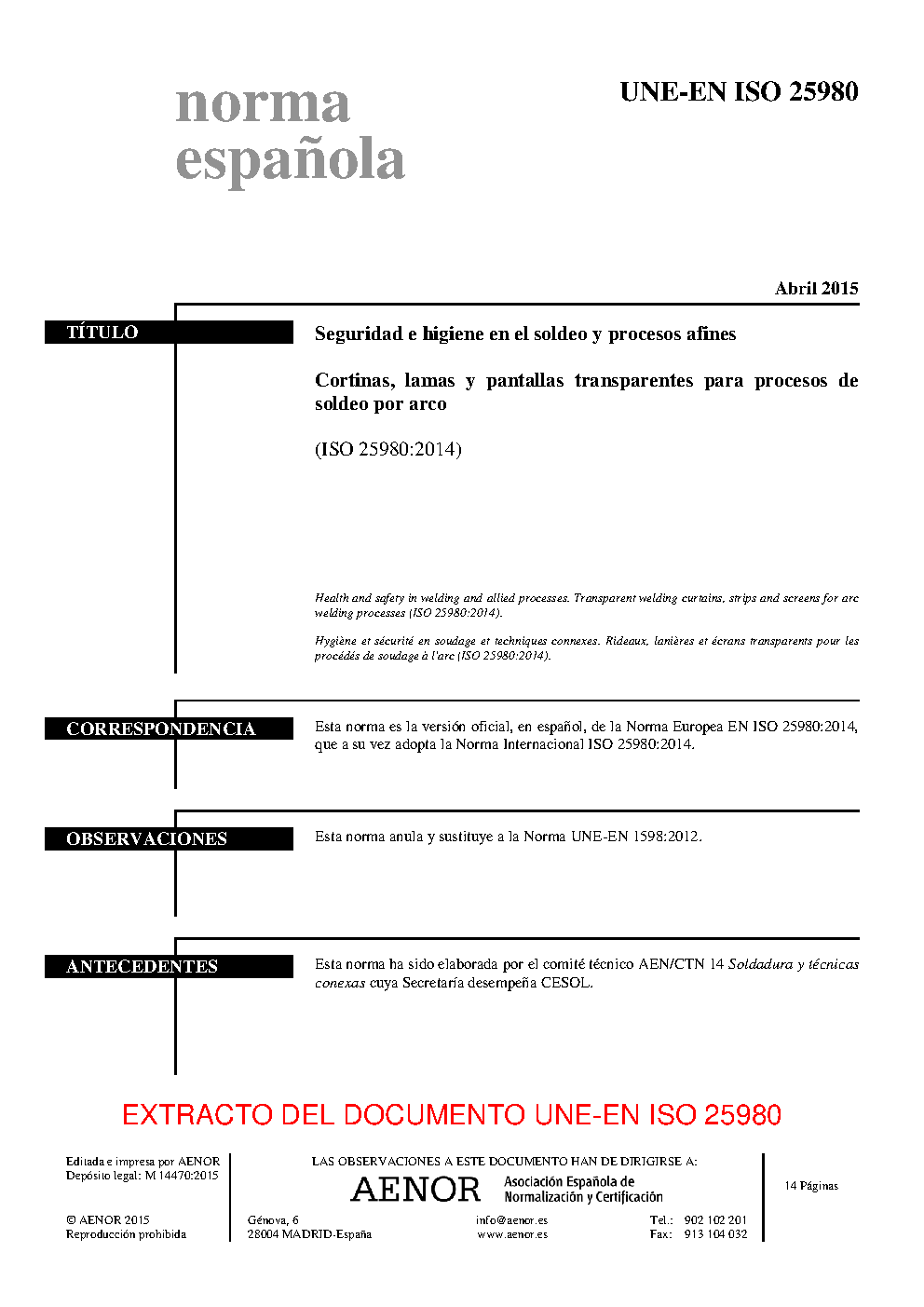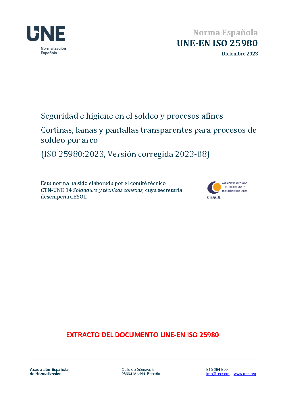Health and safety in welding and allied processes - Transparent welding curtains, strips and screens for arc welding processes (ISO 25980:2014)