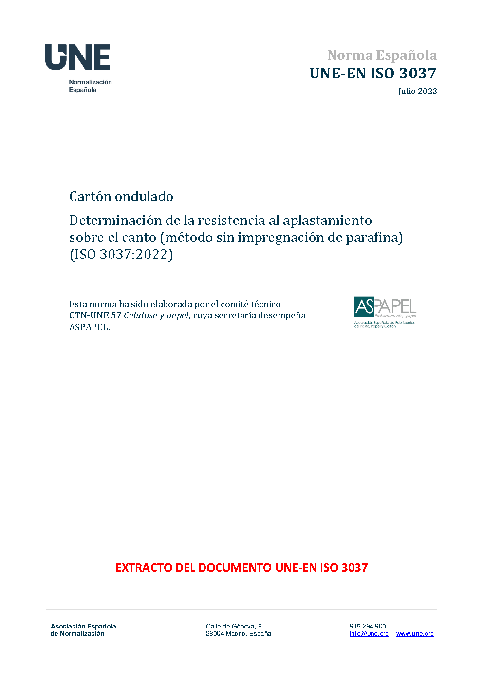 CORRUGATED FIBREBOARD. DETERMINATION OF EDGEWISE CRUSH RESISTANCE (UNWAXED EDGE METHOD). (ISO 3037:1994).