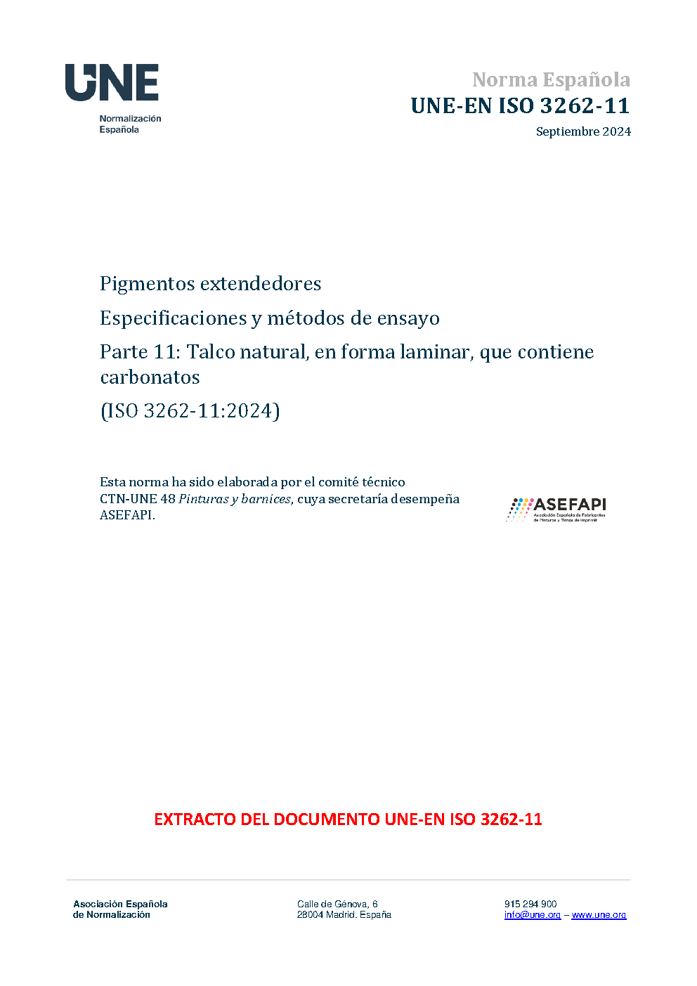 Extenders for paints - Specifications and methods of test - Part 11: Natural talc, in lamellar form, containing carbonates (ISO 3262-11:2000)