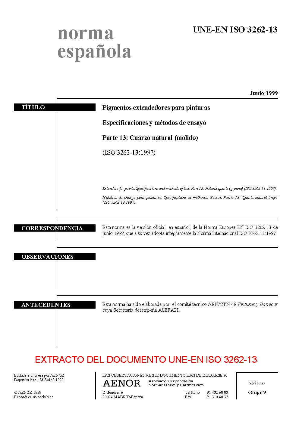 EXTENDERS FOR PAINTS - SPECIFICATIONS AND METHODS OF TEST - PART 13: NATURAL QUARTZ (GROUND) (ISO 3262-13:1997)