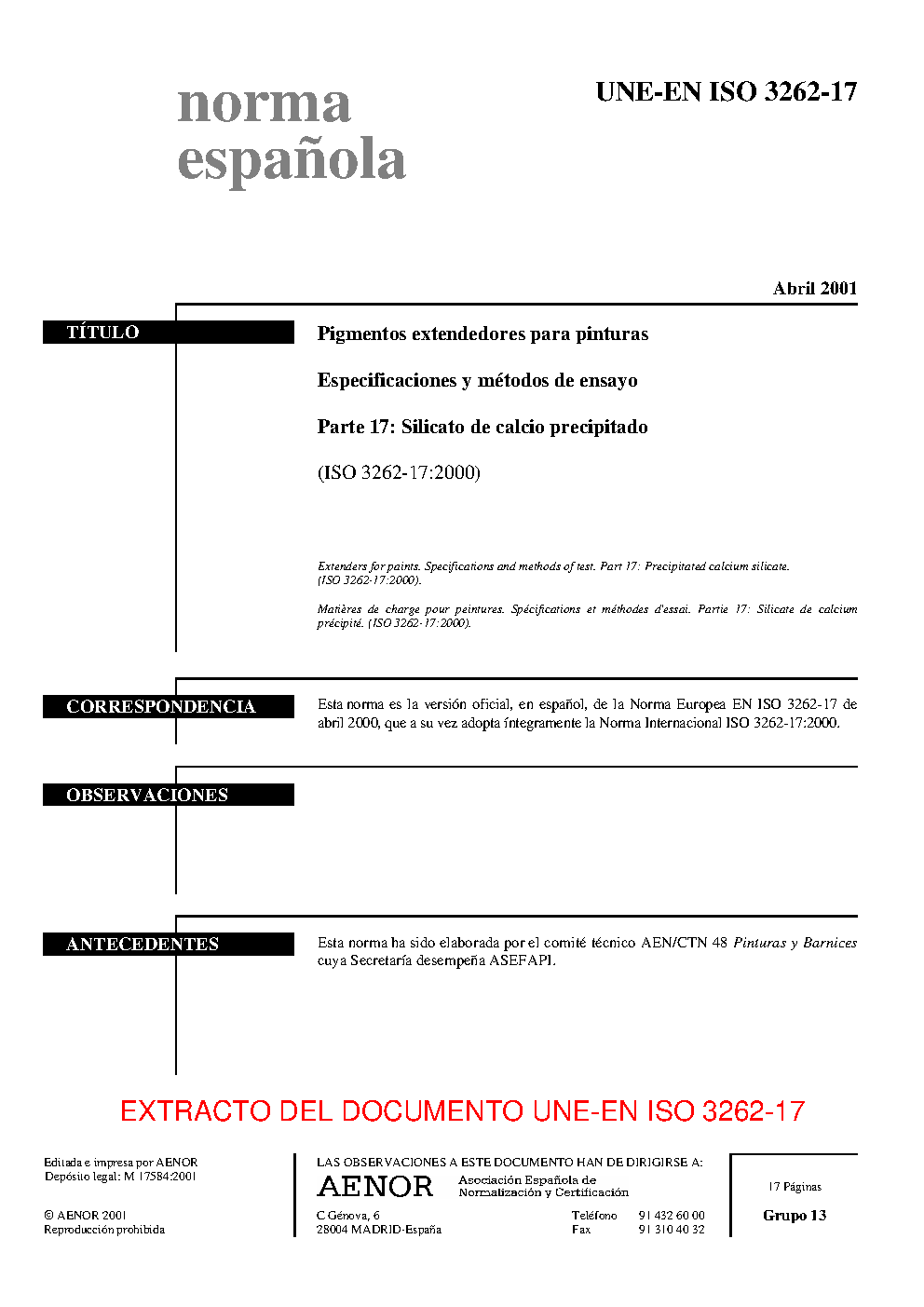 Extenders for paints - Specifications and methods of test - Part 17: Precipitated calcium silicate. (ISO 3262-17:2000)