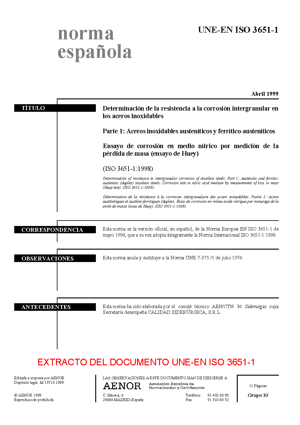 DETERMINATION OF RESISTNACE TO INTERGRANULAR CORROSION STAINLESS STEELS. PART 1: AUSTENITIC AND FERRITIC-AUSTENITIC (DUPLEX) STAINLESS STEELS. CORROSION TEST IN NITRIC ACID MEDIUM BY MEASUREMENT OF LOSS IN MASS (HUEY TEST) (ISO 3651-1:1998)
