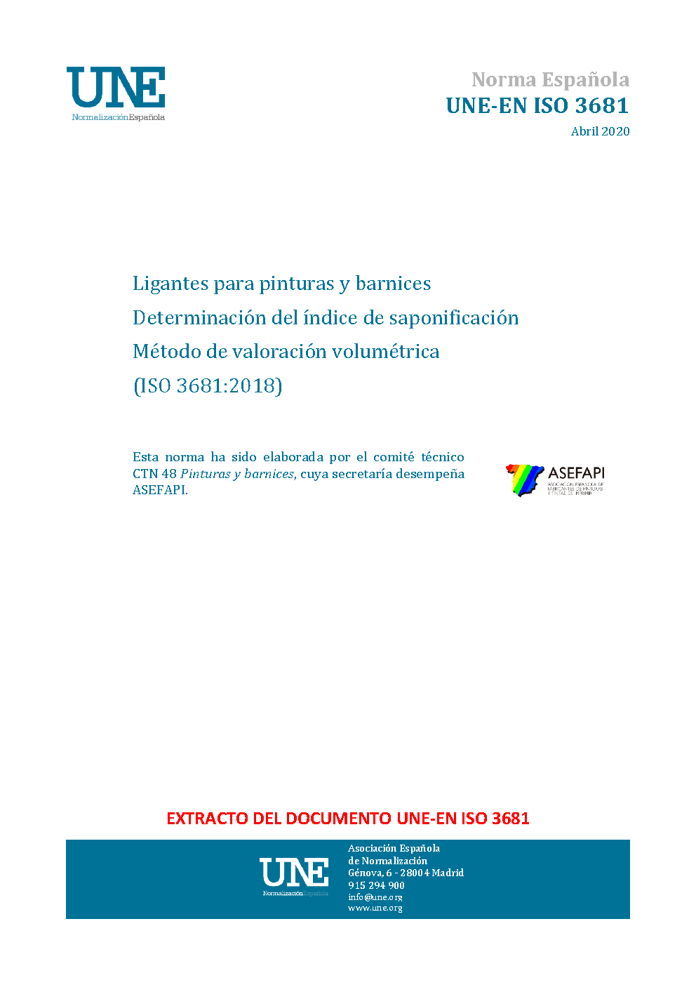 BINDERS FOR PAINTS AND VARNISHES. DETERMINATION OF SAPONIFICATION VALUE. TITRIMETRIC METHOD. (ISO 3681:1996).