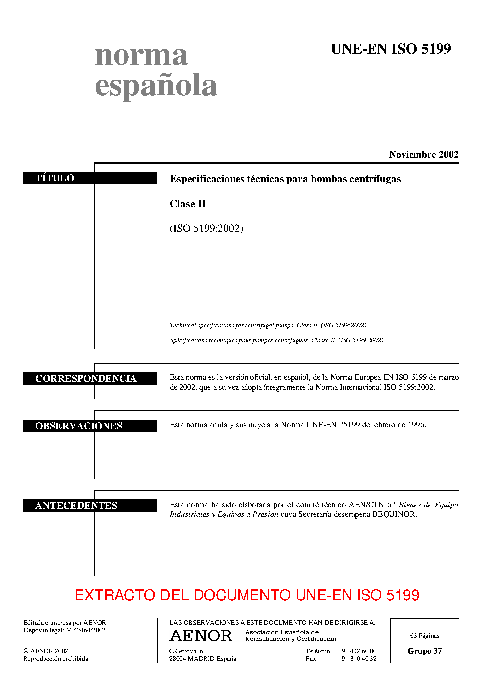 TECHNICAL SPECIFICATIONS FOR CENTRIFUGAL PUMPS - CLASS II. (ISO 5199:2002)