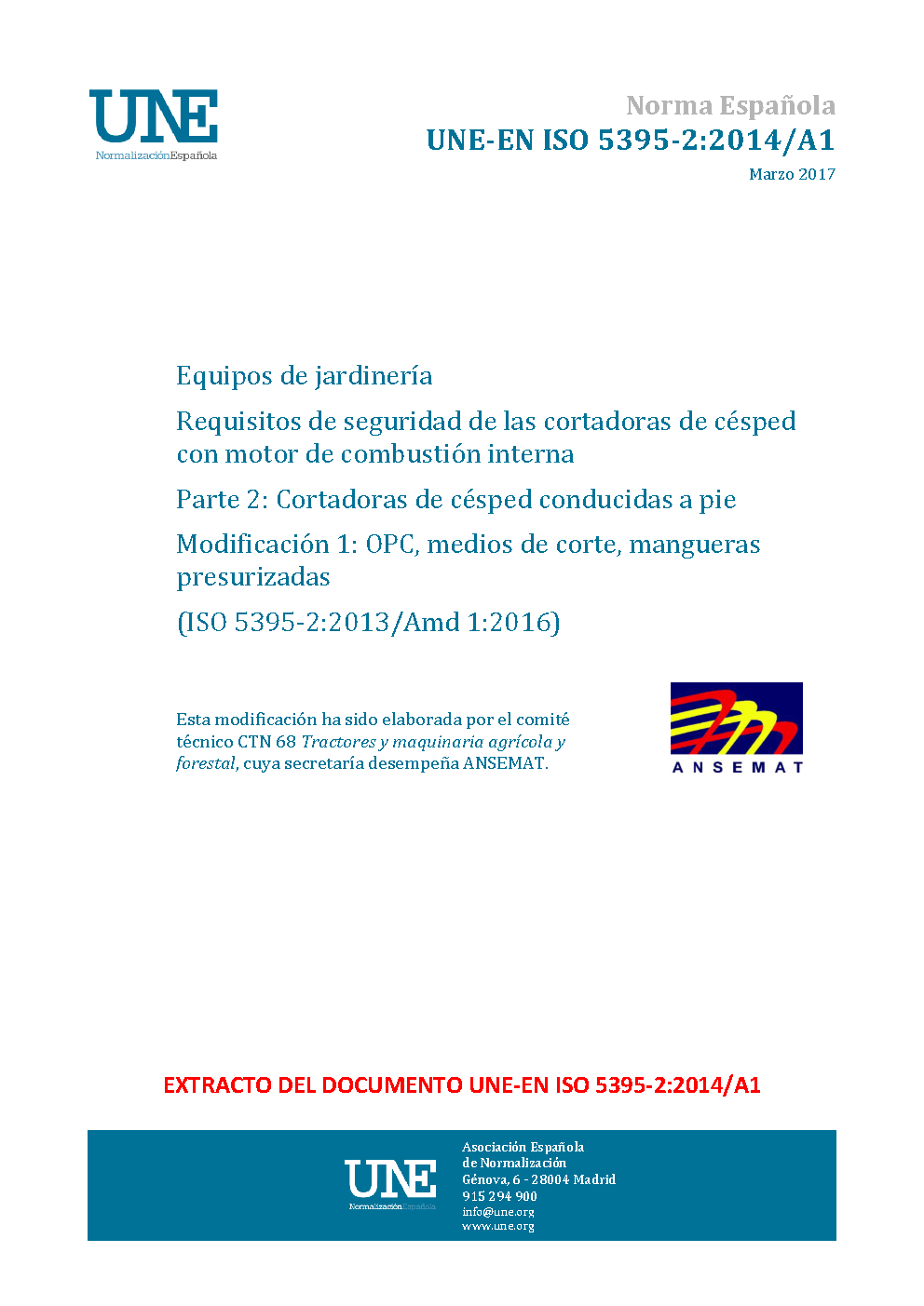 Garden equipment - Safety requirements for combustion-engine-powered lawnmowers - Part 2: Pedestrian-controlled lawnmowers - Amendment 1: OPC, cutting means, pressurized hoses (ISO 5395-2:2013/Amd 1:2016)