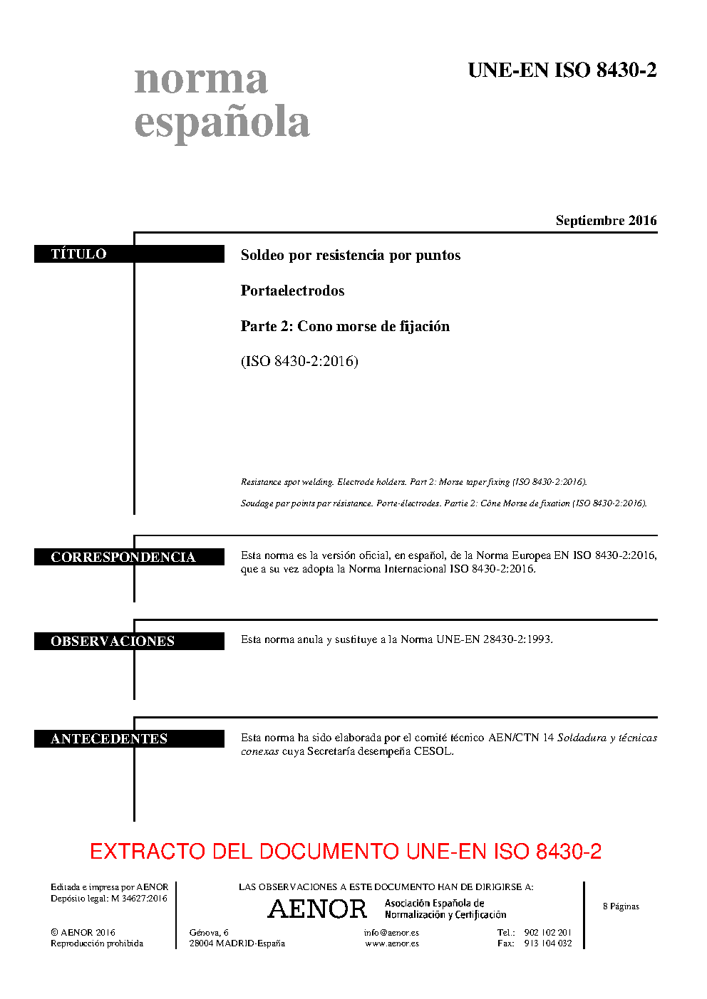 Resistance spot welding - Electrode holders - Part 2: Morse taper fixing (ISO 8430-2:2016)
