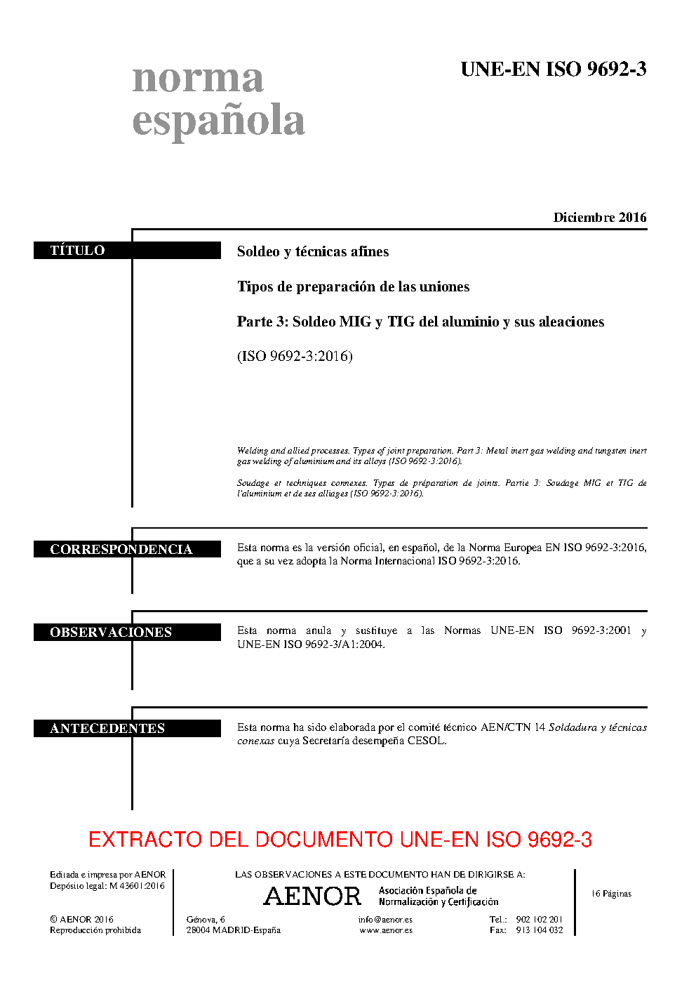 Welding and allied processes - Types of joint preparation - Part 3: Metal inert gas welding and tungsten inert gas welding of aluminium and its alloys (ISO 9692-3:2016)