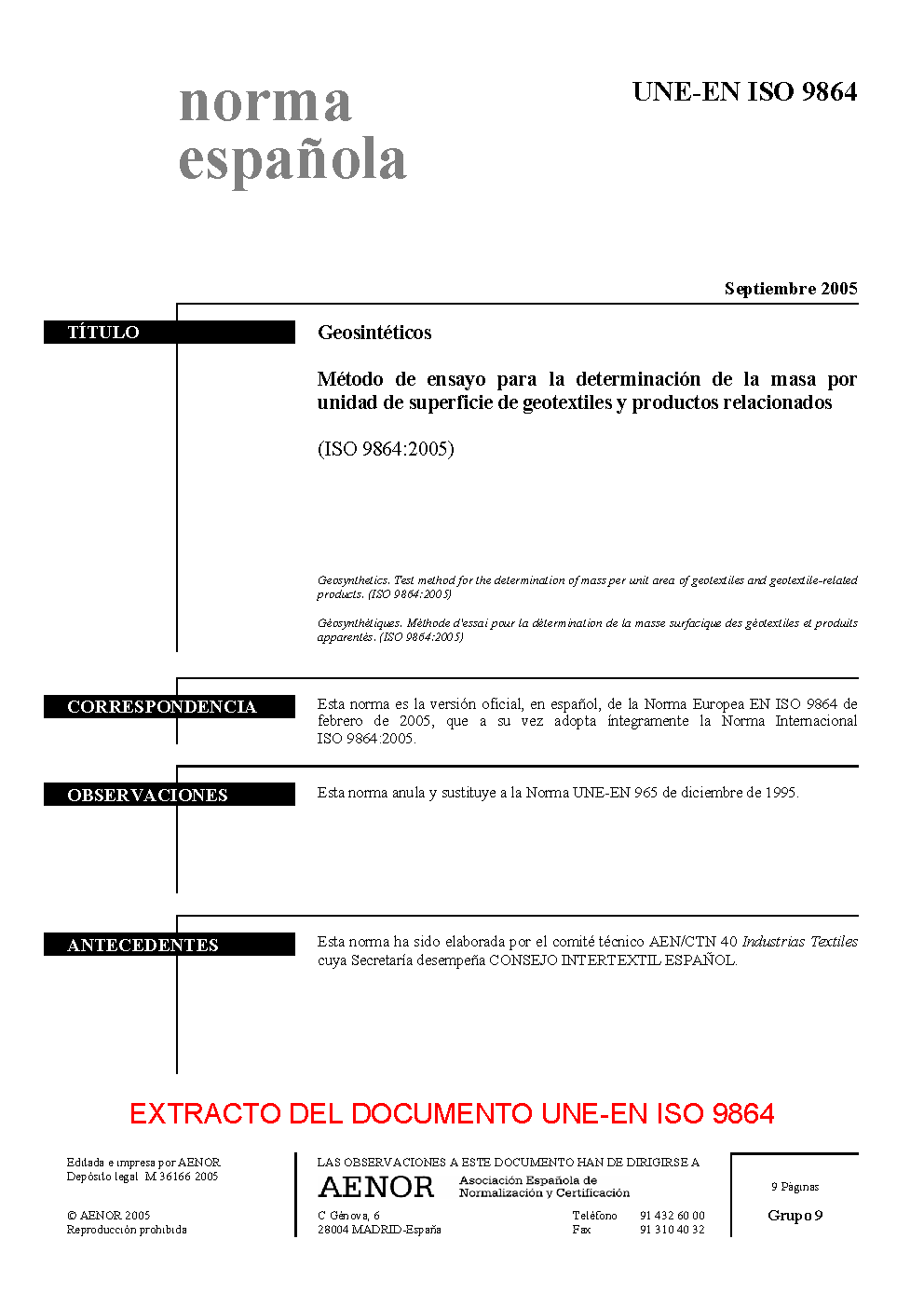 Geosynthetics - Test method for the determination of mass per unit area of geotextiles and geotextile-related products (ISO 9864:2005)