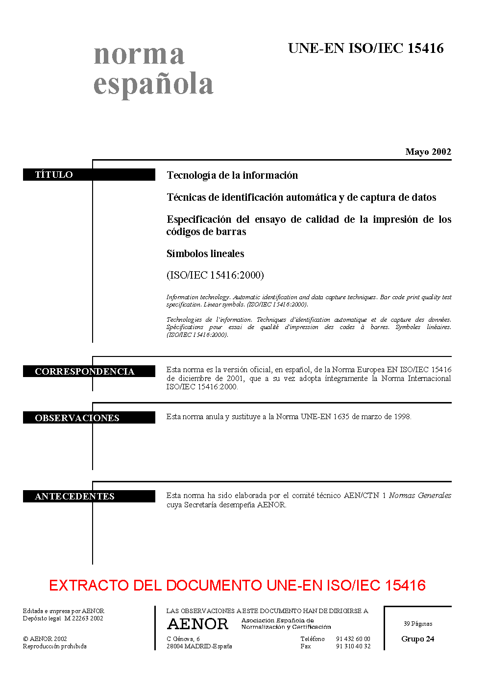Information technology. Automatic identification and data capture techniques. Bar code print quality test specification. Linear symbols. (ISO/IEC 15416:2000)