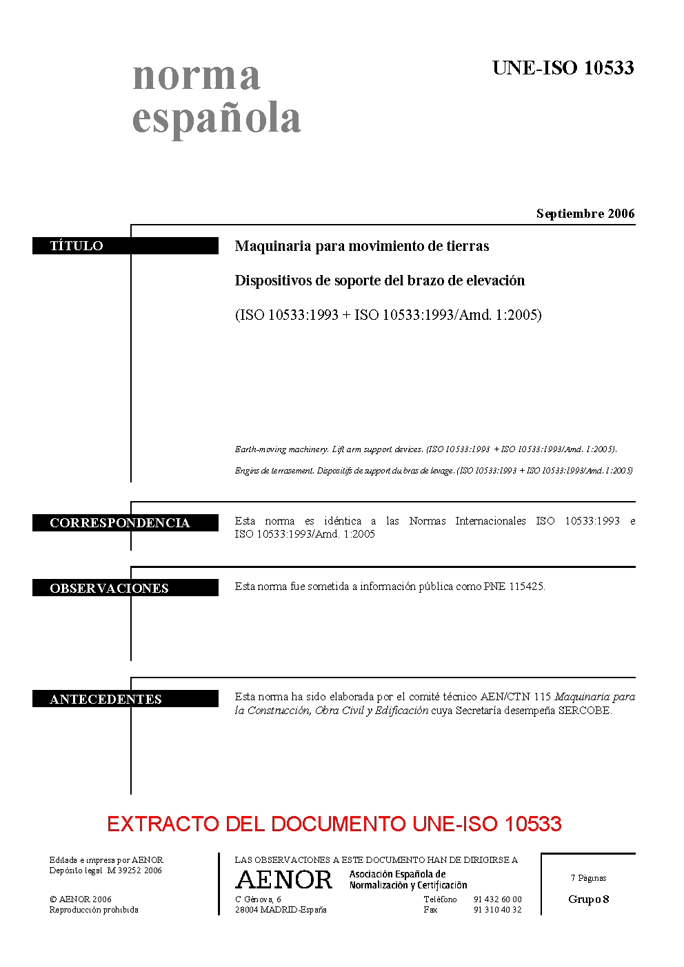 Earth-moving machinery. Lift arm support devices. (ISO 10534:1993 + ISO 10533:1993/Amd. 1:2005)